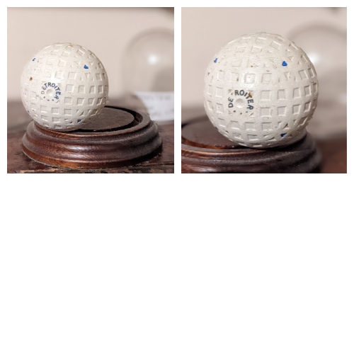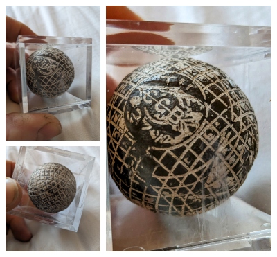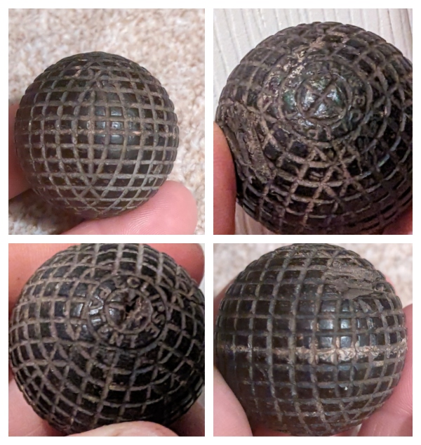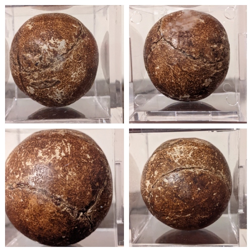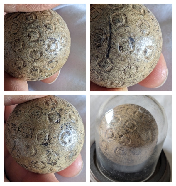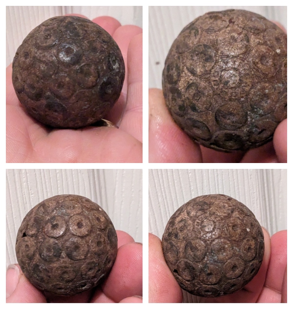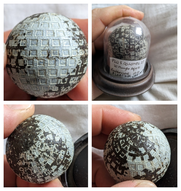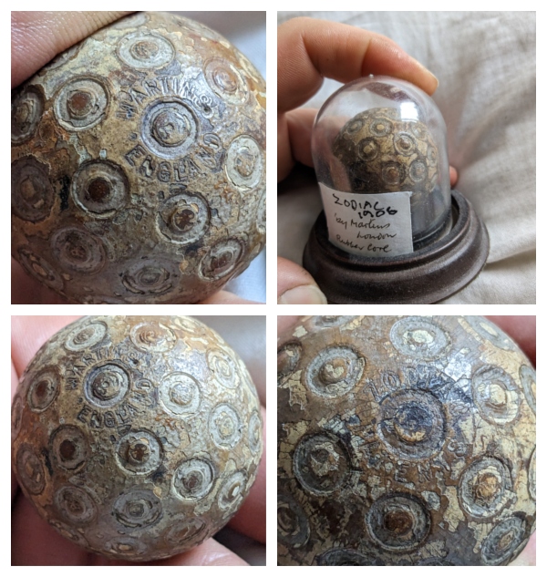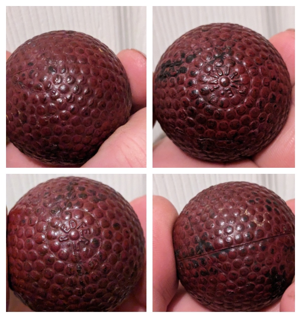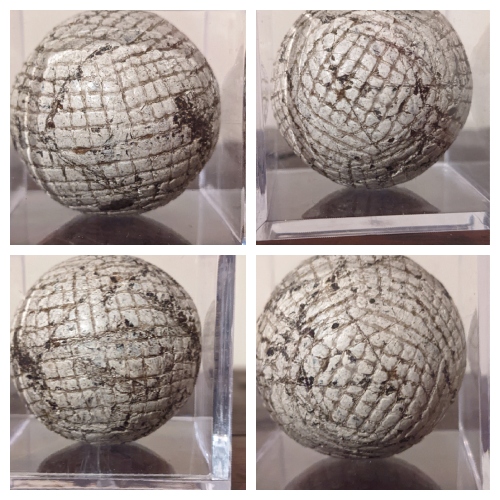 Ref 12-1350-768 Hand Hammered Gutta Percha Ball . Dating around 1855/1860. The pattern is called the "Forgan Pattern" though no makers name is evident... but it is stamped feintly 27 1/2 which is the size of the ball.