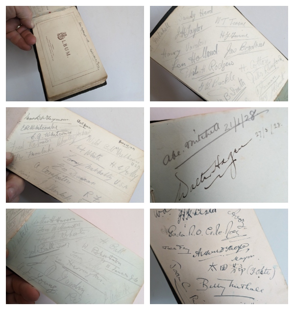 Reference : 543- 1900--76 Autographs from the 1928 Open Golf Championship in St.Andrews. About 54 signatures...all major names have signed including Vardon, Braid, Taylor, Cotyon, some US players including Mielhorn and Walter Hagen , and also Autographs of top tennis players of the time. I know who the book belonged to. Price: Enquire for Price
