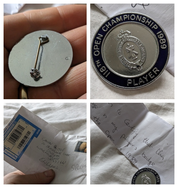 Reference : 14-1500- 33 An Irish Players Badge from 1989 Open Championship with signed letter of provenance. Bought direct from the Ex-Ryder Cup player.