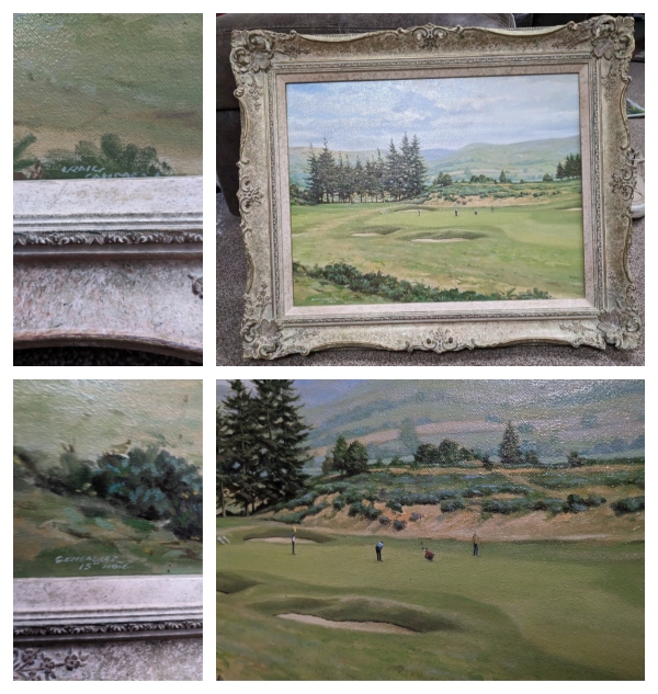 Reference : 14-700-33 Original oil painting of the 15th green at Gleneagles by renowned Scottish artist Craig Campbell. measures about 2 ft x 18 inches. I got in touch with the artist who confirmed it was painted in about 1990 as part of a series. Copy of email communication kept! Some of Campbell's paintings have sold for it n excess of 10k. SOLD